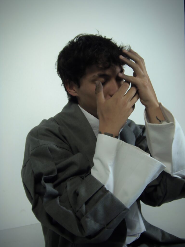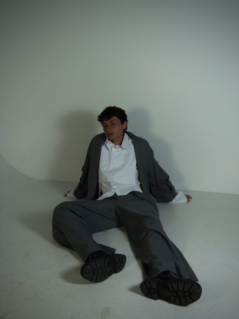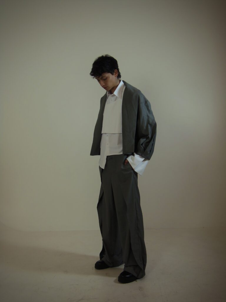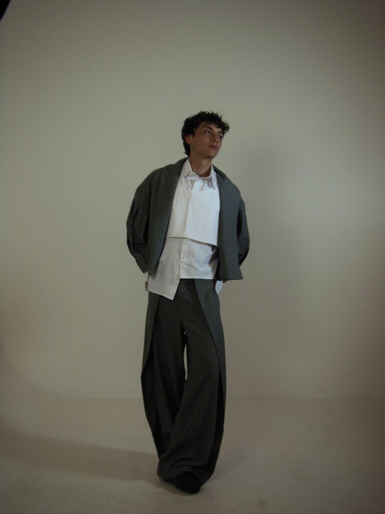 Durante toda la conceptualización, quisimos resaltar siempre que esta colección es un manifiesto visual que muestra el equilibrio entre esos dos mundos que son los sueños y las pesadillas; es por esto que escogimos trabajar con una textura que creamos desde cero en el textil y que se aprecia en la manga de la chaqueta del outfit que fue confeccionado, llamado Gathering, que le da relieve, volumen y dramatismo a la prenda. Las calzas están en la camisa y el pantalón del outfit. En la camisa tenemos unos sobrepuestos, uno rectangular con terminado asimétrico que está incluido en la confección de la camisa y cae en la parte frontal y posterior de la prenda, y, otro sobrepuesto, ubicado en la parte frontal de la camisa y que es removible; el pantalón, cuenta con unos sobrepuestos laterales que están incluidos en la confección de este y que tienen un corte asimétrico. El outfit involucra aquellos detalles que representan el concepto y que identifican la colección.
